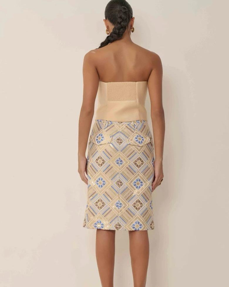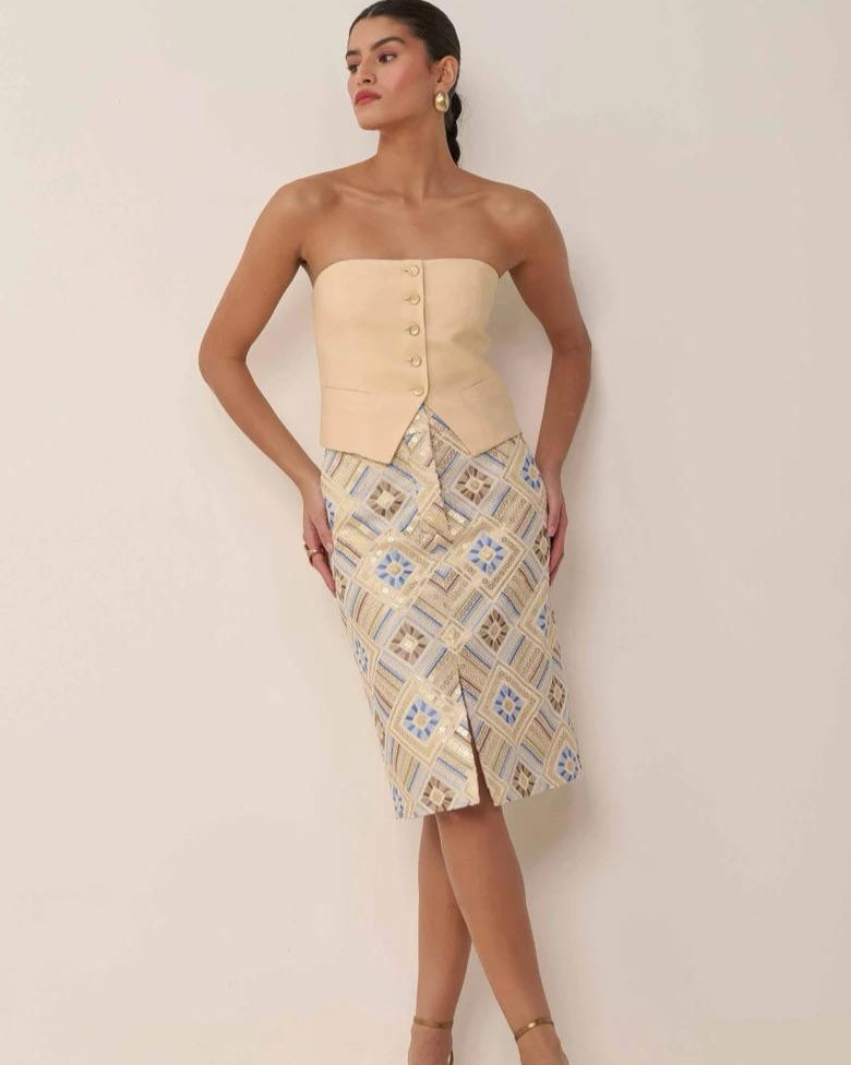 Saia reta, confeccionada em tecido com base 80% algodão, todo bordado com linha acetinada, levemente salpicado com paetês no ouro fosco. Abotoamento frontal com botões embutidos, fenda frontal e comprimento longo abaixo dos joelhos.