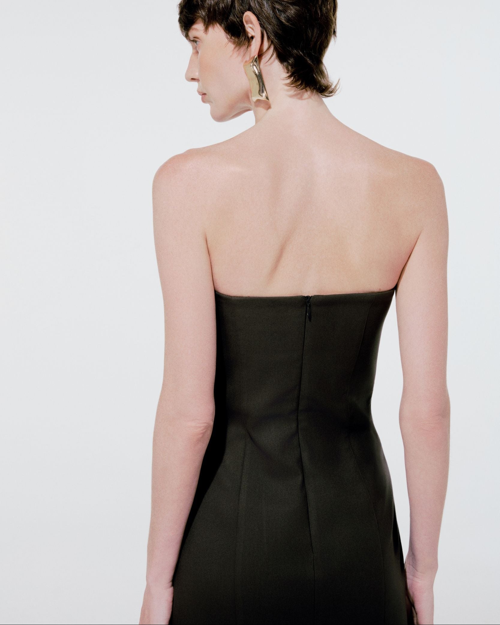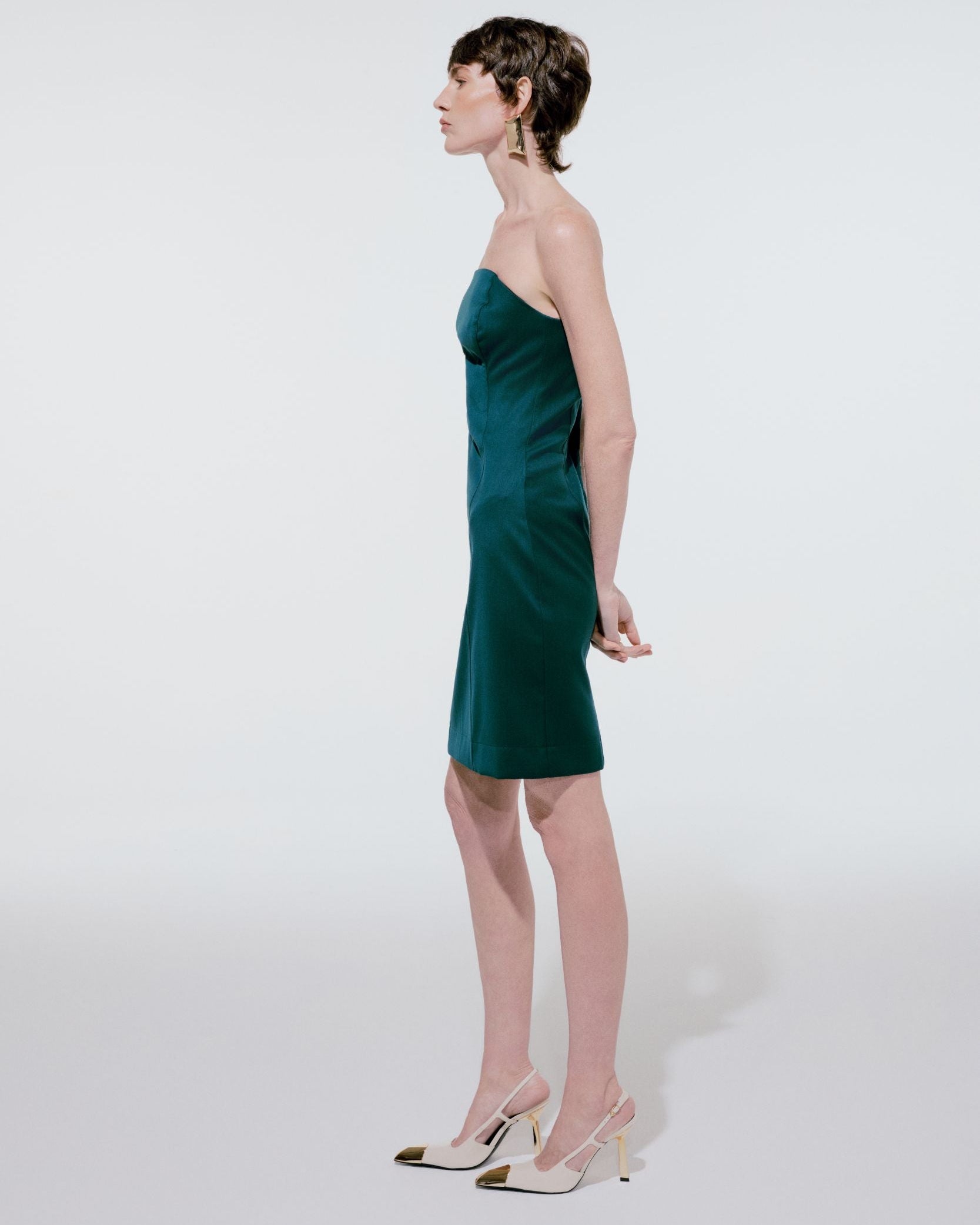 O Vestido Tais em lã fria traduz elegância clássica com acabamento impecável. Com modelagem ajustada e decote tomara que caia, valoriza a silhueta de forma estruturada e refinada.