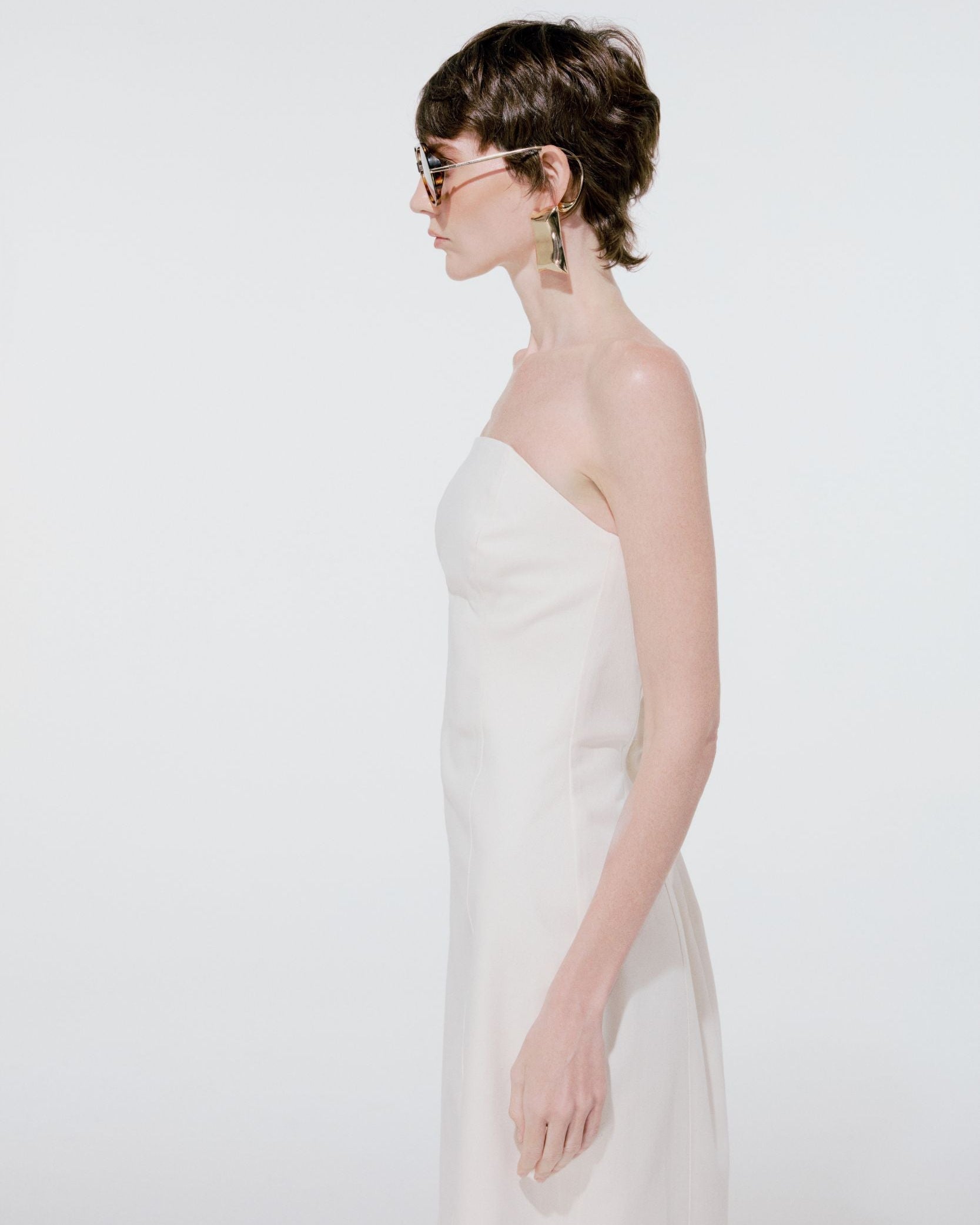 O Vestido Tais em white denim traz uma proposta moderna e elegante com toque contemporâneo. Com modelagem ajustada e decote tomara que caia, valoriza a silhueta com estrutura e sofisticação.